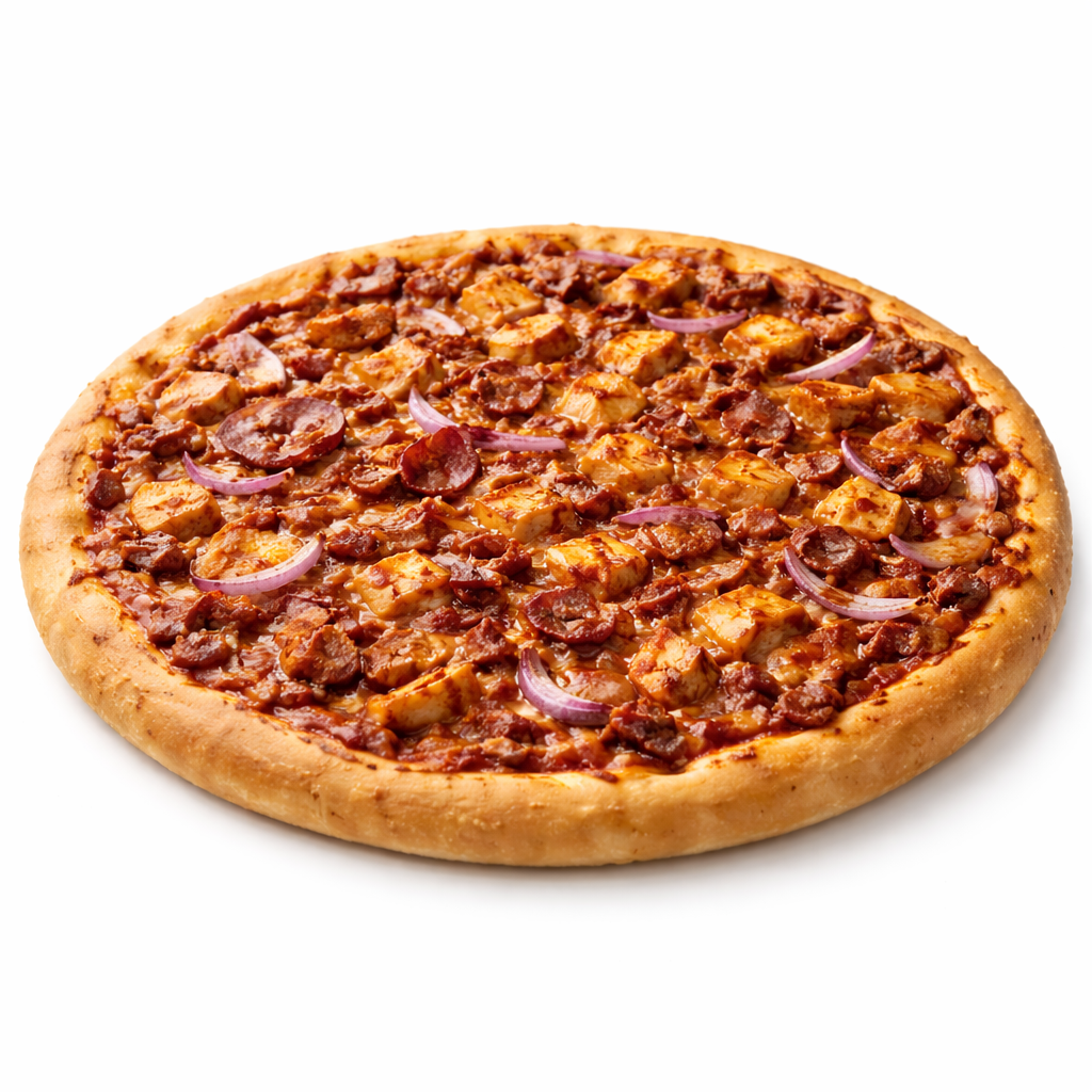 Our stone-baked pizza is crafted with care and high-quality ingredients. The large 12″ base is complemented by a vibrant tomato sauce, melted cheese, and fluffy bbq toppings.
