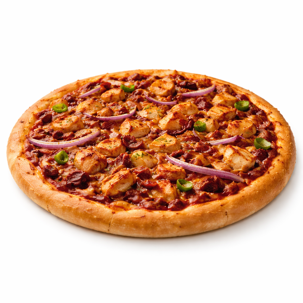 Our stone-baked pizza is crafted with care and high-quality ingredients. The medium 9″ base is loaded with a vibrant tomato sauce, melted cheese, and succulent bbq toppings.