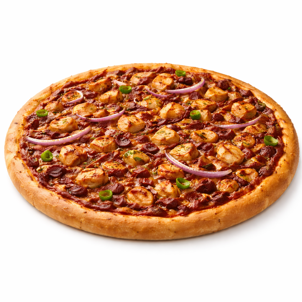 Our stone-baked pizza is crafted with care and high-quality ingredients. The x-large 15″ base comes with a vibrant tomato sauce, melted cheese, and richly flavored bbq toppings.